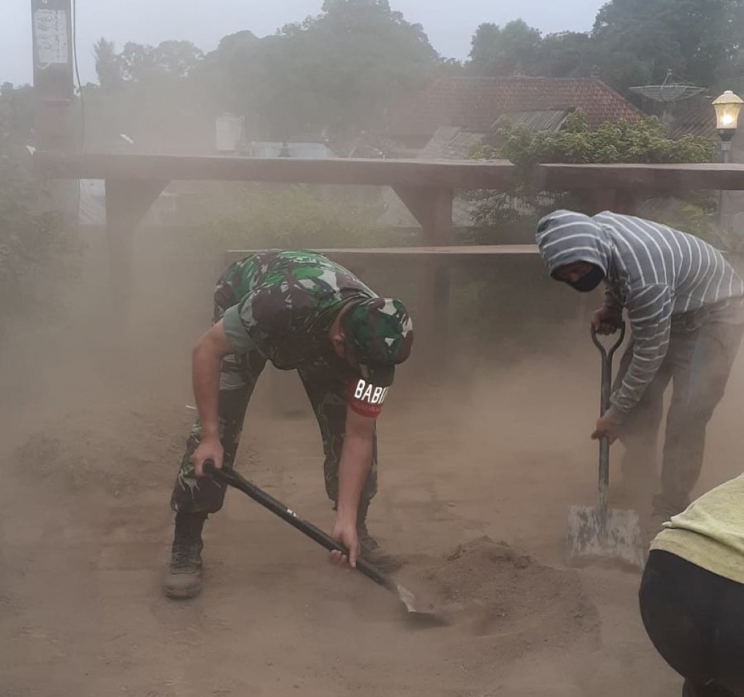 Bersama masyarakat, Babinsa Desa Bayung Gede dan Perangkat desa serta masyarakat melaksanakan gotong royong membersihkan sisa endapan tanah yang menutup badan jalan, rumput dan sampah daun kering di lingkungan jalan Desa Bayung Gede.