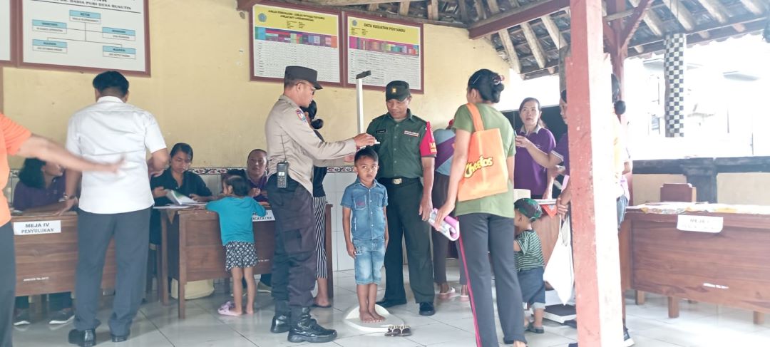 Babinsa Desa Bunutin Koramil 01/Bangli Kodim 1626/Bangli Peltu I Ketut Udayana secara rutin melaksanakan pendampingan kegiatan Posyandu pemeriksaan tumbuh kembang Balita dan Posbindu pemeriksaaan tensi, kolestrol dan gula darah untuk usia 15 tahun keatas yang bertempat di Balai Banjar Dadia Puri, Jl. Pegesengan, Desa Bunutin, Kecamatan Bangli, Kabupaten Bangli. Rabu (7/6).